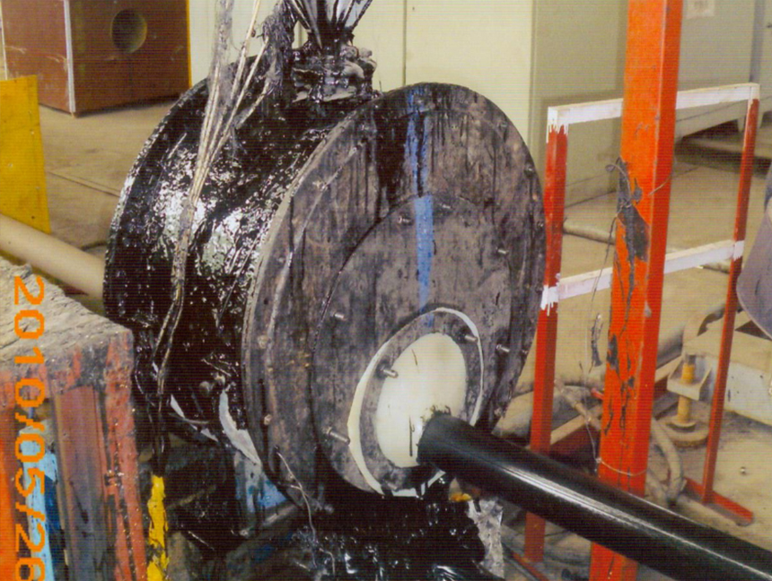 3、將預(yù)熱至70~90℃的鋼管通過已調(diào)整好的涂膠器刮膠環(huán),使熔融后的膠均勻涂到鋼管外壁。